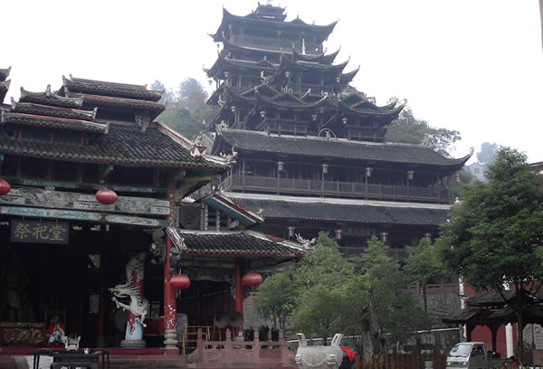 九重天世襲堂是土家風(fēng)情園的精華和靈魂所在。該建筑由土家民間藝人李宏進(jìn)設(shè)計(jì),依80度陡坡而建,高48米,共9重12層,整個(gè)樓房全部用木栓連接,沒有一顆鐵釘,堪稱土家族建筑史上的奇跡。2002年9 月22日,九重天吊腳樓被載入世界吉尼斯世界紀(jì)錄,認(rèn)定其為目前中國(guó)最大、最高、最完美的木質(zhì)結(jié)構(gòu)吊腳樓。2001年4月6日,朱镕基總理視察土家風(fēng)情園時(shí),對(duì)九重天贊不絕口:“一批民間匠人能造出這樣輝煌的吊腳樓,而且還解決了力學(xué)的問題,真是不簡(jiǎn)單!鼻迦A大學(xué)著名建筑學(xué)家何重義先生說:“張家界土家風(fēng)情園完全可以和蘇州的園林相媲美。特別是九重天世襲堂,猶如玉宇瓊閣,令人神往!”古人說,天有九野,地有九州,土有九山,山有九寨。古人又把九重叫做天,說天有九重,最上一重是上帝和君主居住的地方,所以我們叫它“九重天”。