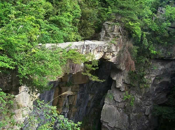 仙人橋又稱天下第一橋,坐落在猴子坡上、天子峰下的王爺洞對(duì)面。橋?qū)僮匀恍纬,長(zhǎng)26米,寬1.5米,厚一米多,高約六七十 米,飛架在兩岸懸崖絕壁之上,鬼斧神工,惟妙惟肖,古人云:“天地可掬,此真天造也”。仙人橋?yàn)榧t砂巖結(jié)構(gòu),兩端生有高大的黃山松和杜鵑樹,濃蔭掩映,極其美麗。橋的東頭還有自然形成的石級(jí),人可順石級(jí)而下,走上天橋,下視萬(wàn)丈深淵,令人頭暈?zāi)垦#墙颜卟桓矣庠,旅游者無(wú)不贊嘆,說(shuō)它是“天下絕景”。