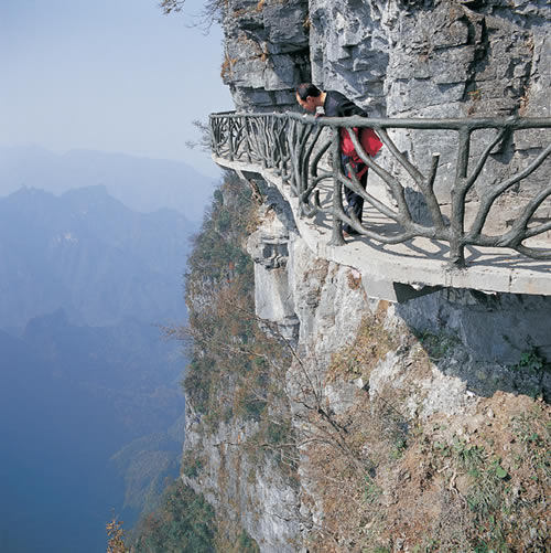 據(jù)施工人員介紹,此條棧道也是他們所修棧道中施工最難,最險(xiǎn)峻的一條。如果您還覺得不夠刺激的話,在棧道的完結(jié)處的兩個(gè)懸崖之間有一條長(zhǎng)160米的懸索吊橋,同時(shí),在海拔最高點(diǎn)還有一個(gè)挑戰(zhàn)心里極限的玻璃站臺(tái),在這里,如果你能挺直腰板伸開雙臂,那么,您就是真正的勇士了。