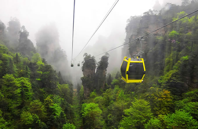 楊家界風光 楊家界索道是世界自然遺產(chǎn)武陵源風景名勝區(qū)繼天子山索道、黃石寨索道后的第三條客運索道,上站位于八里坡游覽線劉家檐,下站位于中湖鄉(xiāng)野溪鋪村。該索道采用法國,斔鞯涝O備,是世界頂級雙回路循環(huán)式配置八人車廂式索道,全長1876米,上下站垂直高差517米,線路支架14個,最高運行速度6m/s,最大運力為2300人/小時,單程運行時間5.2分鐘,是目前國際最先進的客運索道。