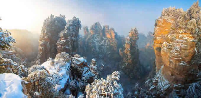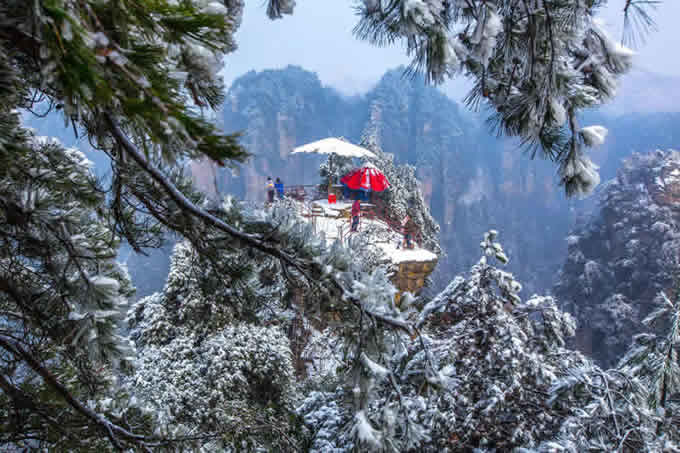 楊家界雪景 作為世界自然遺產(chǎn)武陵源四大核心景區(qū)之一的楊家界景區(qū),地勢險要,風景絕美,跟張家界、天子山、索溪峪比較,其中的地質地貌一部分相同外,又有其獨特的資源優(yōu)勢,擁有全球罕見的峰墻群奇光。乘坐在舒適的楊家界索道里,可以盡情體驗“會當凌絕頂,一覽眾山小”的居高臨下與動感,360度暢游夢想般的楊家界仙界,俯瞰“近在咫尺”的千山萬壑,山舞銀蛇,千嬌百媚的絕美“峰墻”盡收眼底,無限風光在險峰,數(shù)十道氣勢如虹的石墻,一排排層巒疊嶂,相對平行而立,高矮參差不齊,宛如“天然長城”,真是美輪美奐,絕景天賜,不得不讓人驚嘆大自然的璧山開地之功。