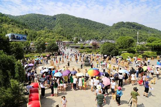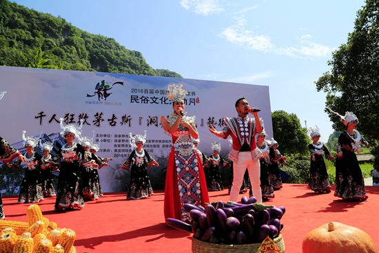 7月29日上午9點30分,由張家界市人民政府主辦,張家界市委宣傳部、市旅游和外事僑務(wù)委員會、市文體廣電新聞出版局、武陵源區(qū)人民政府承辦,黃龍洞景區(qū)協(xié)辦的“絕版張家界,最炫民族風(fēng)”張家界民俗活動月第三場活動在黃龍洞景區(qū)啟動。現(xiàn)場以土家人慶祝豐收的鼓舞拉開序幕,土家鼓舞歡悅的節(jié)奏,夸張的舞姿開場就吸引了幾千游人和當(dāng)?shù)厝擞^看。草根夫妻檔歌手,張家界“山水組合許勇、舒維亮麗的服飾,野性的嗓音……”以一首《我在高山唱》歌曲,征服現(xiàn)場游客,贏得雷鳴般的叫好聲。
